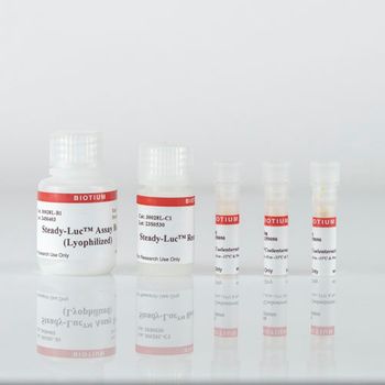 Firefly luciferase is widely used as a reporter for studying gene regulation and function, and for pharmaceutical screening. It is a very sensitive genetic reporter due to the lack of endogenous activity in mammalian cells or tissues. However, the light production resulting from the reaction leads to formation of suicidal adenyl-oxyluciferin at the enzyme surface. It results in very short half-life of the light emission with a flash-type kinetics. Because of this, flash-type luminescence must be detected immediately after initiating the reaction, which is not compatible with batch analysis of samples. Biotium's Steady-Luc™ HTS assay system is a proprietary mixture of substances that modify the enzymatic reaction to produce a long lasting signal (steady glow) by preventing the formation of adenyl-oxyluciferin at the enzyme surface. It is a homogeneous high sensitivity firefly luciferase reporter gene assay kit with a half-life of about 3 hours for the quantification of firefly luciferase expression in mammalian cells, allowing batch processing in microplates. Glow-type luciferase assays like Steady-Luc™ have lower luminescence signal compared to flash-type assays. The sensitivity and limit of detection of the assay will depend on luciferase expression levels in your experimental system as well as luminometer sensitivity. The Steady-Luc™ Firefly HTS Assay Kit (Lyophilized) is comparable to our original Steady-Luc™ HTS Assay, but with assay buffer provided in lyophilized format for economical shipping and convenient storage. Simply dissolve the lyophilized assay buffer in the supplied reconstitution buffer before use.
