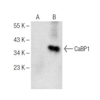 mouse monoclonal IgG1; CaBP1 Antibody (A-4) is an IgG1 λ mouse monoclonal CaBP1 antibody (also designated CaBP1 antibody) that detects the CaBP1 protein of mouse, rat and human origin by WB, IP, IF and ELISA. CaBP1 Antibody (A-4) is available as both the non-conjugated anti-CaBP1 antibody form, as well as multiple conjugated forms of anti-CaBP1 antibody, including agarose, HRP, PE, FITC and multiple Alexa Fluor® conjugates. The calcium binding protein (CaBP) family shares much similarity to calmodulin. It has been shown that CaBP proteins can substitute functionally for, and probably augment the function of, calmodulin. Calcium binding proteins are a crucial part of calcium mediated cellular signal transduction in the central nervous system. There are several members of the family with varying expression patterns. CaBP1 and CaBP2 can be expressed as multiple, alternatively spliced variants in brain and retina. CaBP3, CaBP4 and CaBP5 are restricted to retinal rod and cone cells.